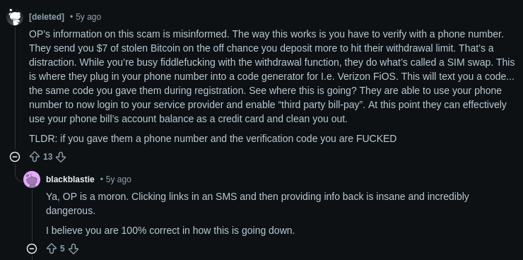 The top comment on that post claims the goal of the scam is to perform a SIM swap attack while you’re [busy] with the withdrawal function. That seemed interesting to me, because when I went through the scam I never saw any option to withdraw anything…