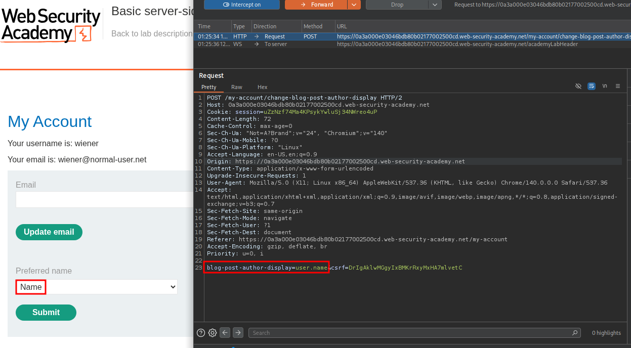 Take this web app from PortSwigger’s Academy, for example. Once logged in, users may select a prefered way to be called by - username, firstname, or nickname. In the requests sent to the backend, this translates to user.name