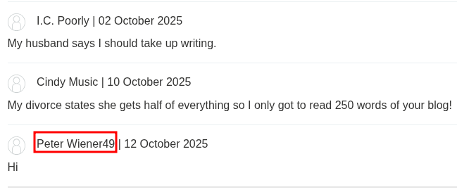 , we suddenly appear as Peter Wiener49 in the comments, since the templating engine is now evaluating {{user.name}}{{7*7}}