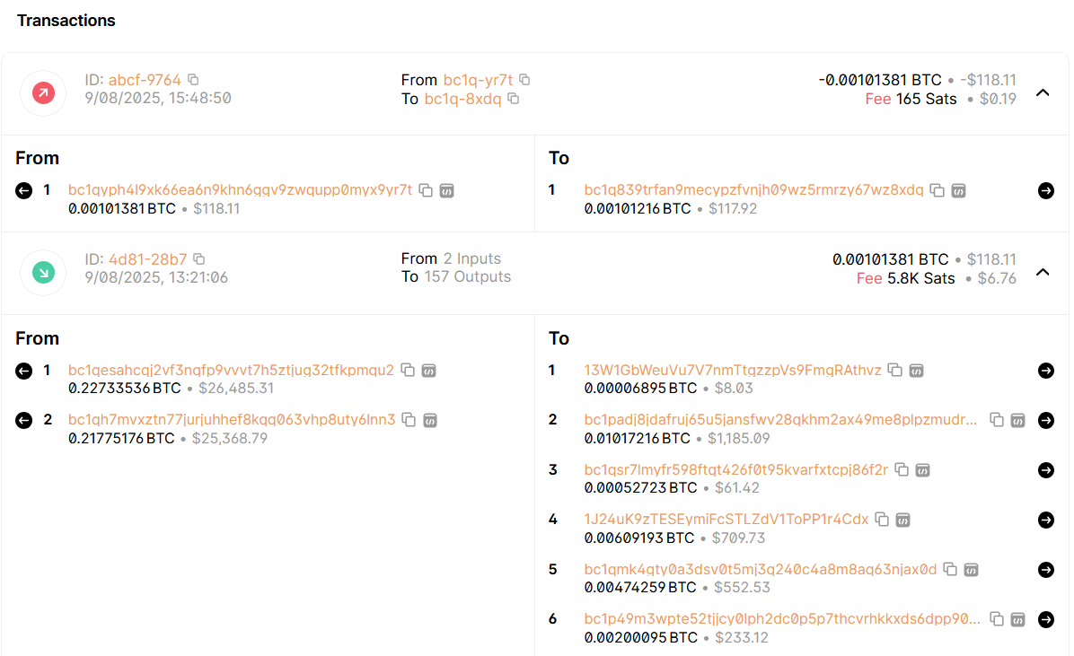 Using a blockchain explorer like Blockchain.com, we can go ahead a look into each wallet to see any transactions that took place. In this case, there is only one wallet which has seen any activity - bc1q…yr7t - which saw 0.00101381 BTC move through it four days prior.