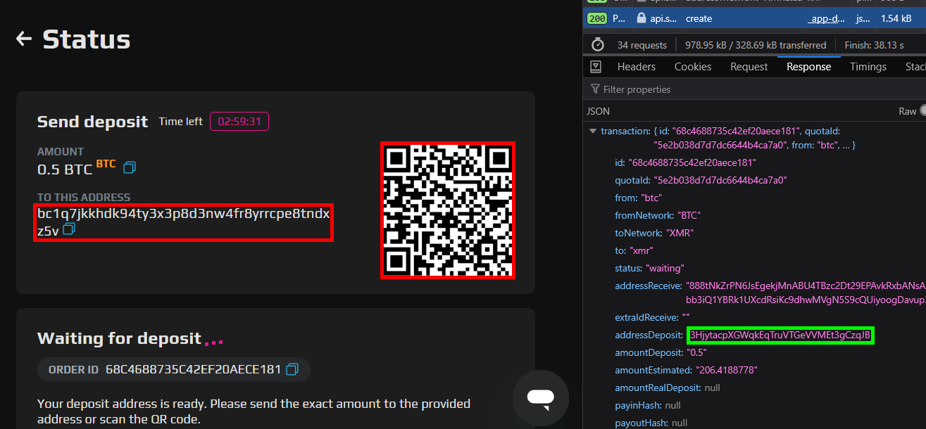 If you go so far as to actually initiate an exchange via ChangeNOW, the malware sneakily replaces the real deposit address (highlighted within the server HTTP response in green) with their own (highlighted on the page in red).