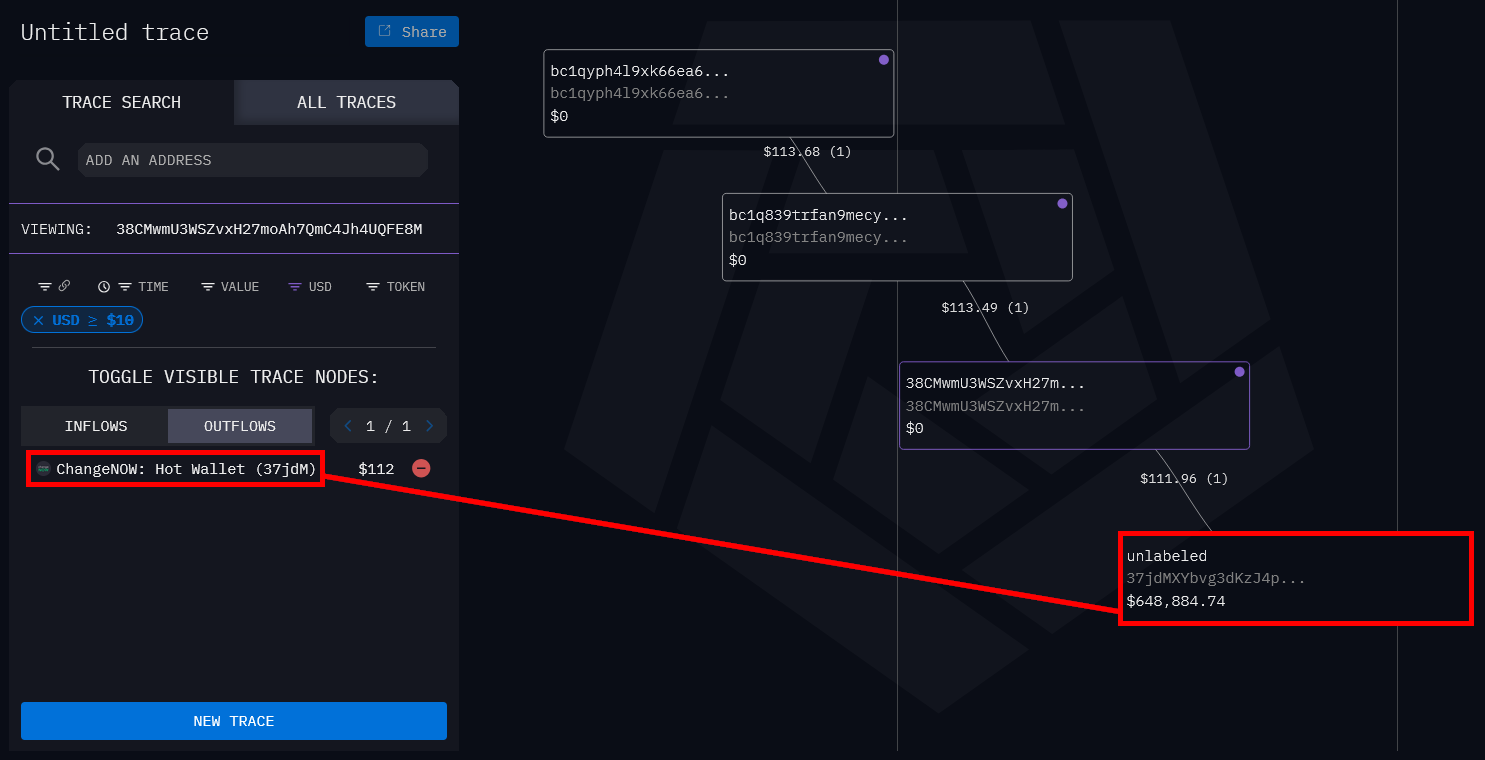 Since the Bitcoin that flowed in to the account appears to have come from some sort of “crypto laundering” service, I think it is safe to say that nobody fell for the scam. What is interesting, however, is that if you follow the money, it eventually does end up in ChangeNOW.
