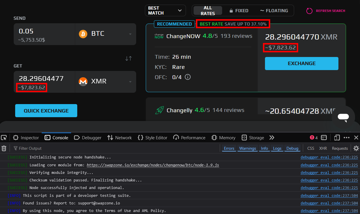 If it determines it is being executed on the correct website, it prints some of the decrypted strings to the console and replaces some values in the UI to make it seem like ChangeNOW is offering $7,823 worth of Monero for $5,753 worth of Bitcoin.