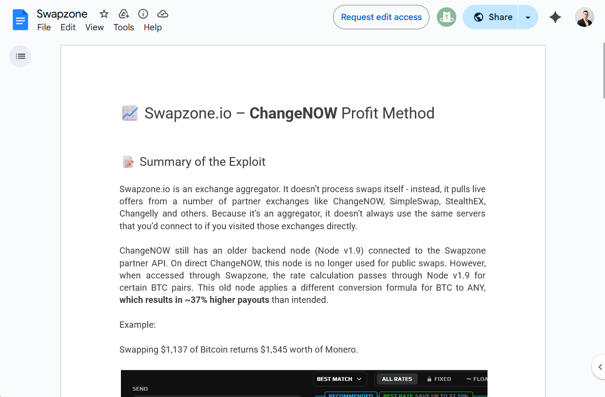 Within the linked document, it was explained that the exchange aggregator Swapzone.io was using an outdated backend node referred to as Node v1.9 to communicate with the crypto exchange ChangeNOW, and that because of this, it would be possible to make a profit of around 37% when converting between Bitcoin and any other cryptocurrency.