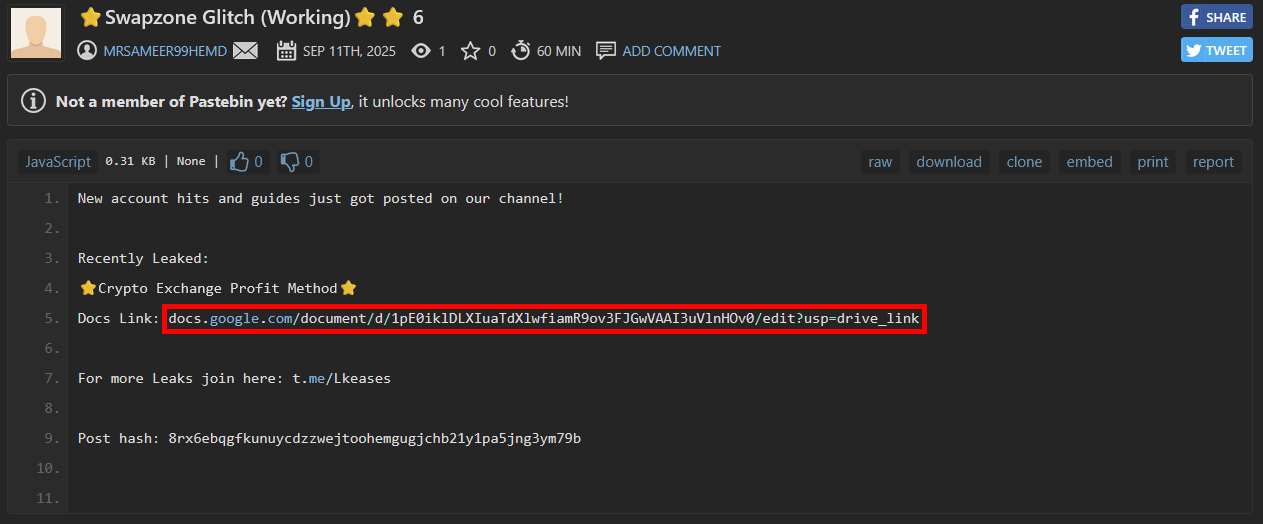 These pastes all contained text claiming that a new methodolgy for profiting off of crypto exchanges had been leaked, and included a link to a Google Docs file.